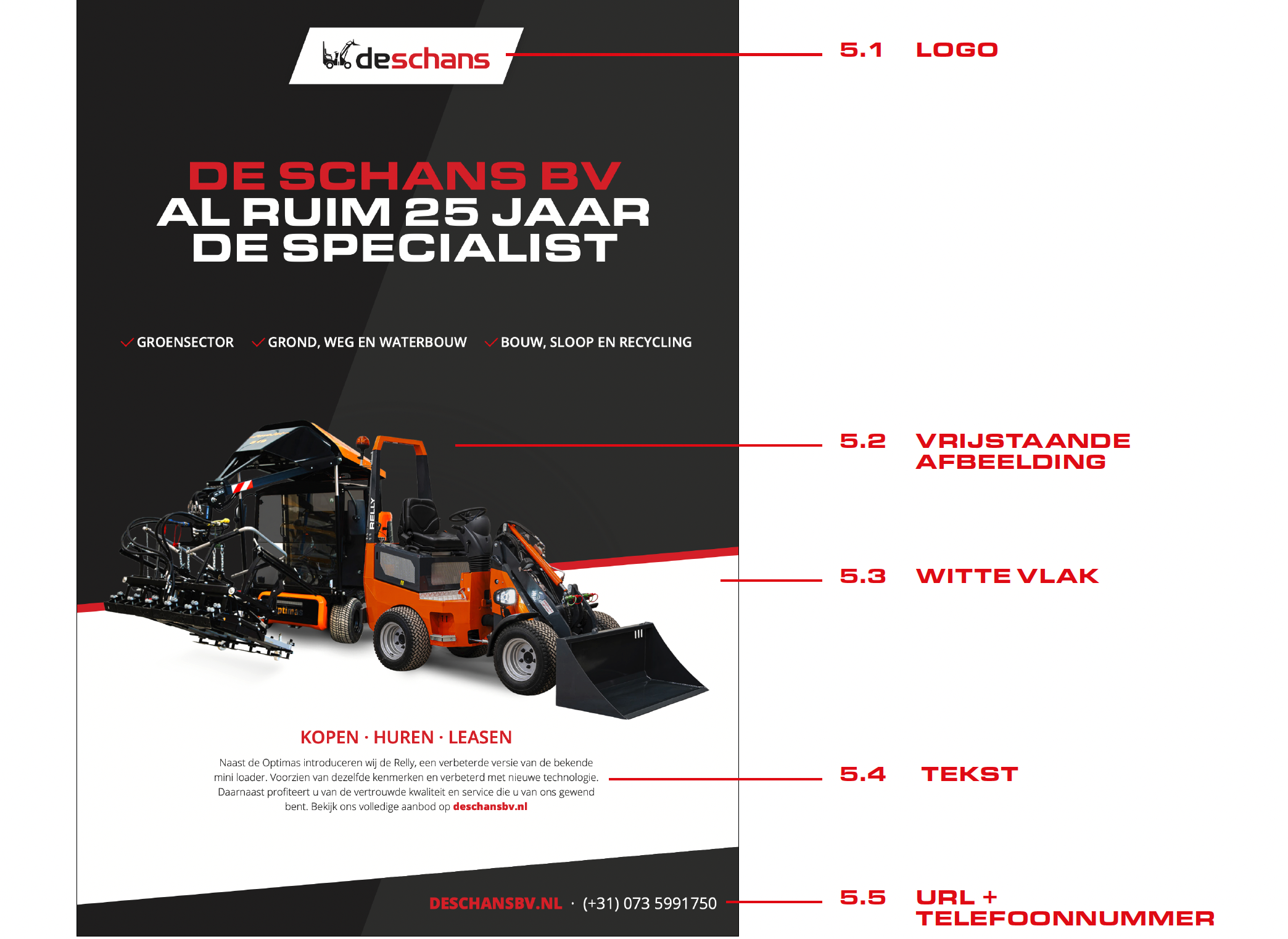 Het witte vlak wordt altijd in combinatie met de rode lijn gebruikt.