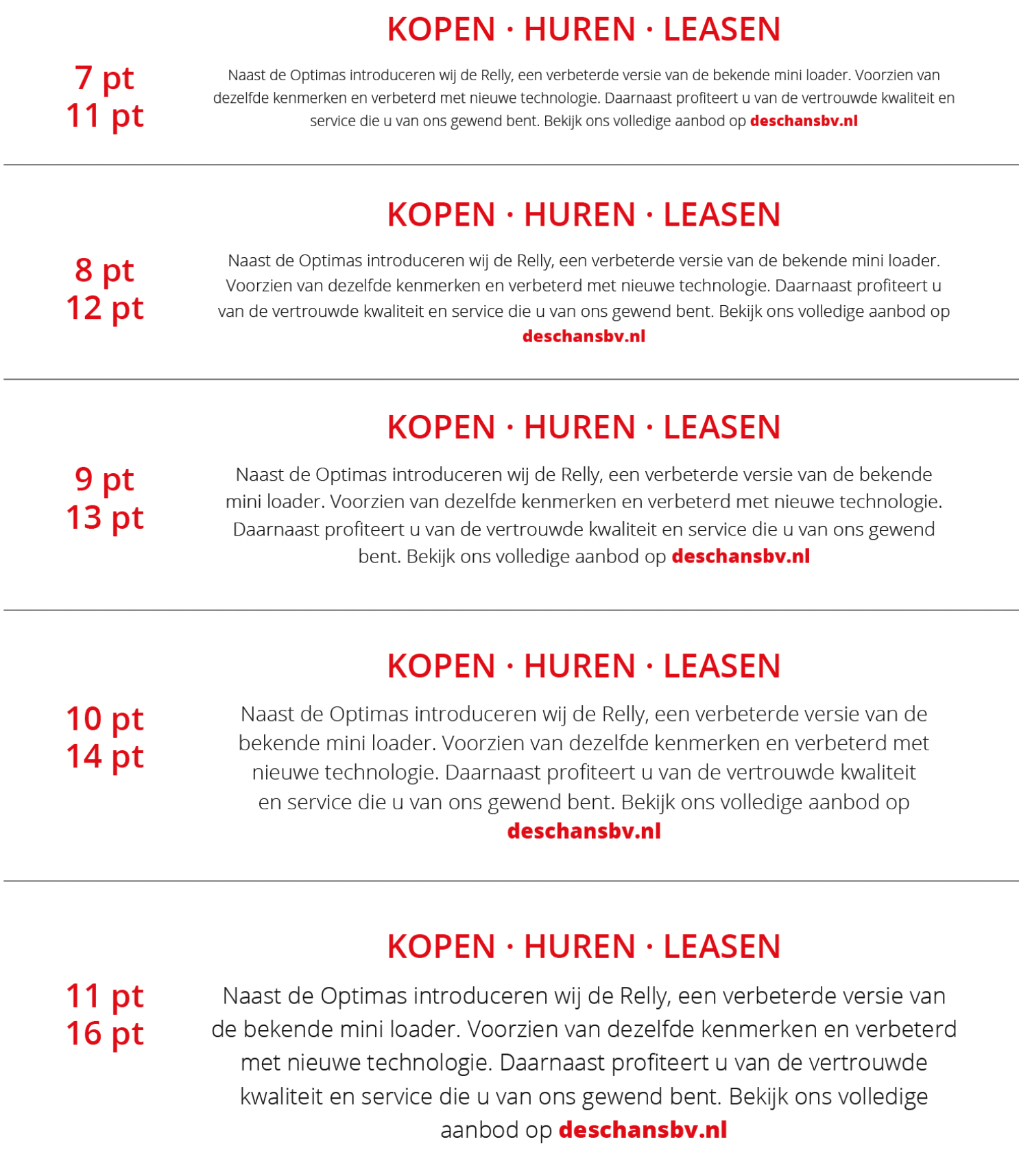 Rechts staan een aantal voorbeelden. De bovenste cijfers zijn de lettergrootte en de onderste cijfers zijn de regelafstanden.